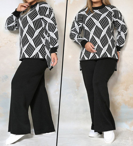 جزئیات: دور سینه 100.قد بلوز 64 قد آستین از یقه 36 فاق شلوار 34 دور ران 50